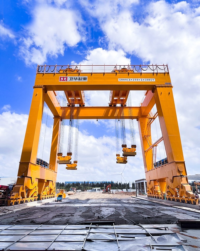 根据项目起吊重量大、工况复杂、控制精度高等特点,hth·华体起重机采用U型门架结构,双龙门四点吊装,最大起吊重量1000t,最大吊点高度大于18m,采用变频+PLC控制,可实现横向、纵向距离可调,及吊梁自由旋转,控制精度达±1mm。